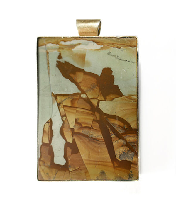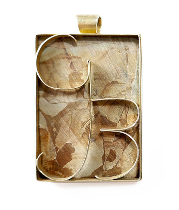 Handgefertigter, hochrechteckiger Korpus, der überwiegend aus einer grafisch gemusterten, an eine Felslandschaft erinnernden, vorderseitig polierten Steinplatte besteht, die durch einen schmalen, vergoldeten Rahmen gefasst ist. Oberseitig einfache, starre Öse in Form einer kurzen Röhre. Rückseitig werden - ebenfalls durch eine schmale vergoldete Zarge - die Initialen "GB" gebildet. Maße Länge mit Anhängeöse knapp 6 cm, Maße des rechteckigen Korpus ca. 5,2 x 3,5 cm, ungeputzter Zustand mit geringen Tragespuren. Wohl 1960er, 70er Jahre.
