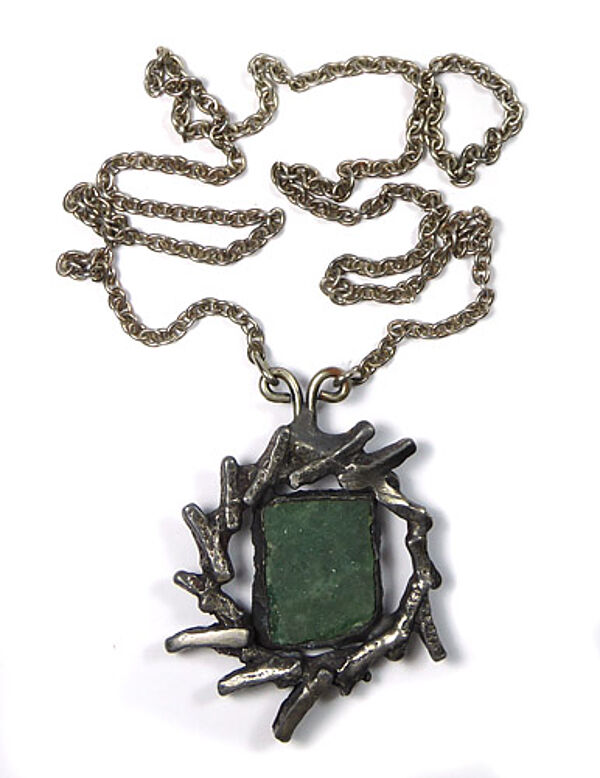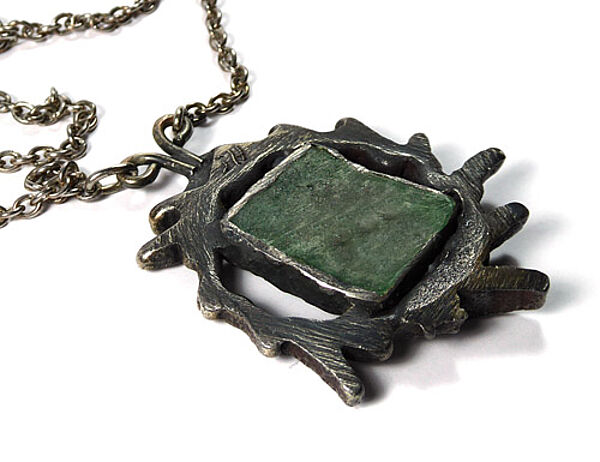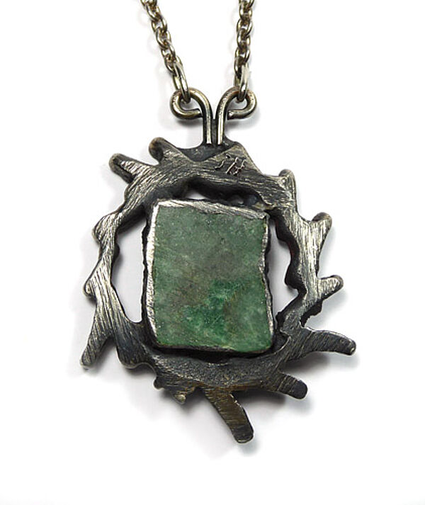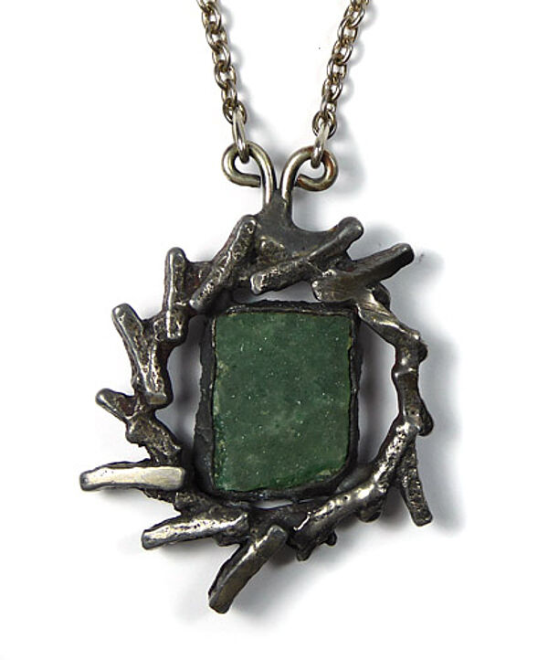 Korpus aus Zinn: ein leicht asymmetrischer Kranz nach außen weisender Stege umgibt eine zargengefasste, grob geschliffene, grüne Schmuckstein-Platte. Oberseitig eiserne Doppelöse, hier setzt auch die einfache Ankerkette aus unedler Metall-Legierung an. Maße des Anhängers ca. 5 x 5 cm, Länge mit Öse ca. 6,5 cm, Kettenlänge ca. 66 cm, ungeputzter Zustand mit moderater, dunkler Patina und leichten Tragespuren. Rückseitig signiert, wohl 1960er, 70er.