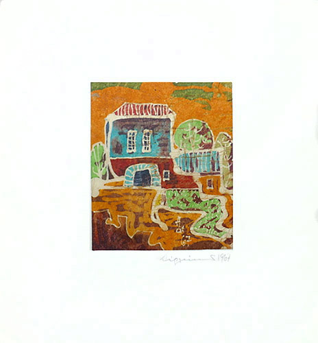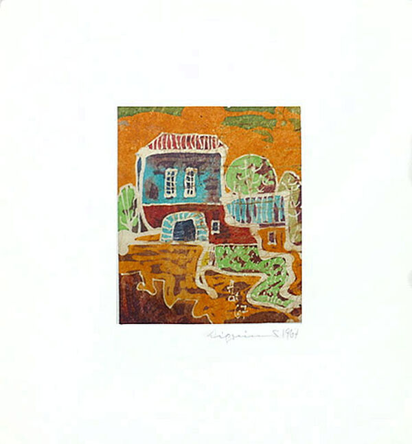 Farbige Batiktechniken auf Japan, in der Darstellung am Unterrand ligiert monogrammiert "ACH" und datiert (19)"67", an den Ecken auf einen weißen Kartonuntersatz montiert, darauf signiert "Aigrinner" und datiert "1967". Bildmaße ca. 9,5 x 8 c, Blattmaße ca. 19,5 x 18 cm, geringe Alters-, Griff- und Lagerspuren.