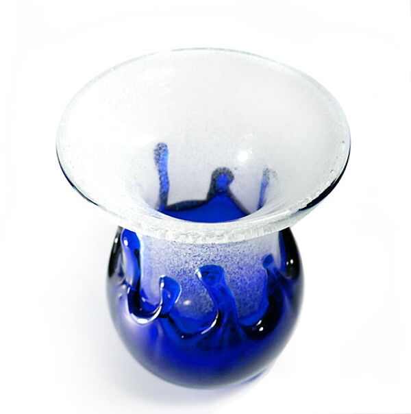 In die Form geblasener, im unteren Drittel gebauchter Korpus aus feinblasig durchsetzem, dickwandigen Klarglas mit weit ausgestelltem Mündungsrand. Die untere Hälfte der Vase ist leuchtend blau überfangen, wobei nach oben weisende Laufnasen bis zur Halsregion reichen. Plan geschliffener Boden. Höhe ca. 16 cm, geringe Altersspuren, so zeigt sich ein kleiner Chip am Stand. Wohl 1960er, 70er Jahre.