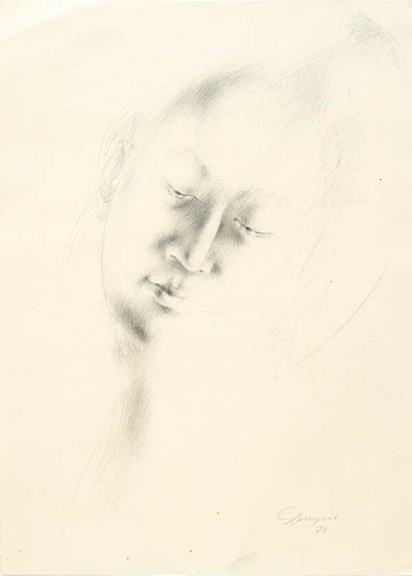 Bleistift auf leicht chamoistonigem Papier, rechts unten mit Bleistift handsigniert und datiert (19)"76", rückseitig zarte Aktskizze. Blattmaße ca. 29,5 x 20,5 cm, kleiner Einriss unten rechts, ansonsten eher geringe Alters-, Griff- und Lagerspuren.