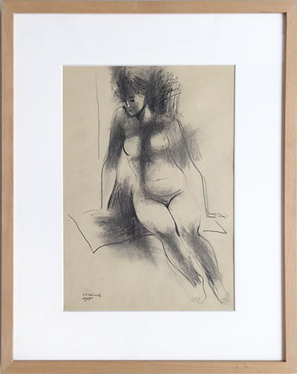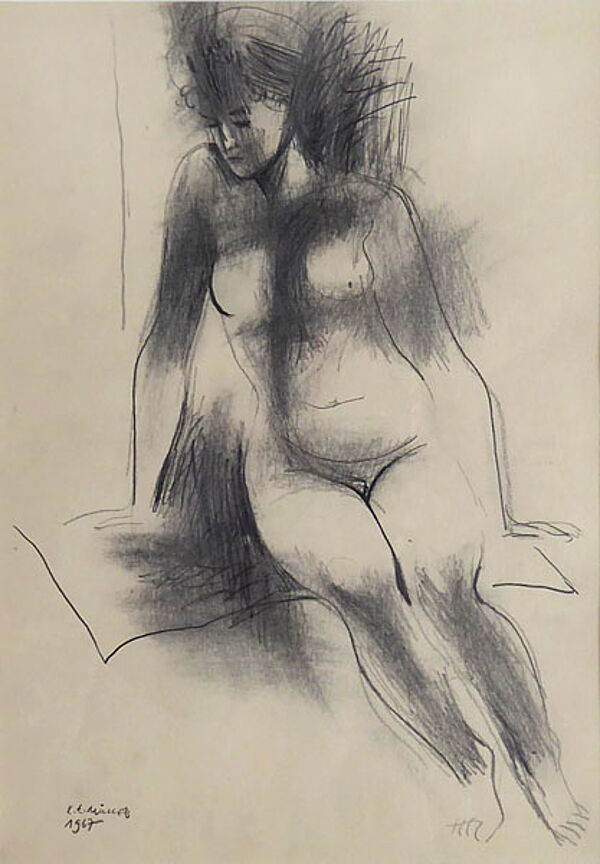 Bleistift auf chamois-tonigem Papier, links unten handsigniert und datiert "1967". Sichtmaße ca. 41,2 x 28,2 cm, Außenmaße der einfachen, neuzeitlichen hellen Holzleiste ca. 62 x 48,5 cm. Geringe Altersspuren.