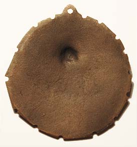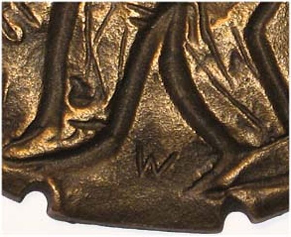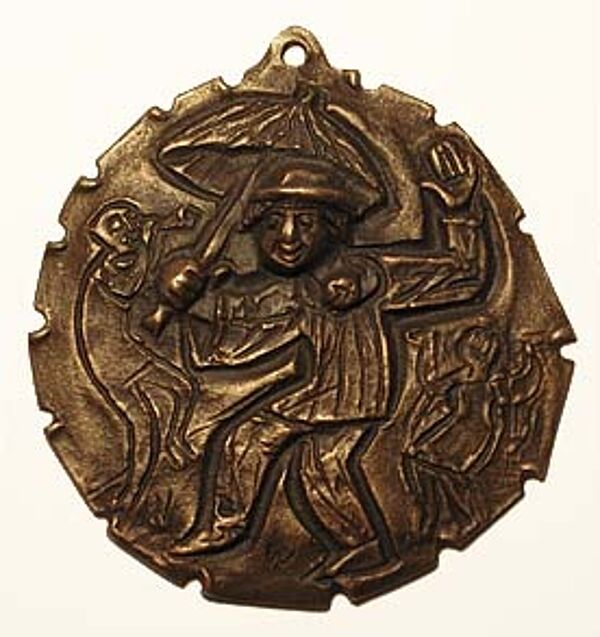 Runder, leicht gewölbter, am Rand gekerbter Korpus aus Bronze mit warmer Patina. Einseitige, reliefierte Darstellung eines Mannes (vermutlich Clown) mit Regenschirm. Unterseitig monogrammiert mit "W". Am oberen Rand "gehenkelt" (Öse zur Aufhängung). Durchmesser ca. 8,5 cm. Wohl 70er Jahre.