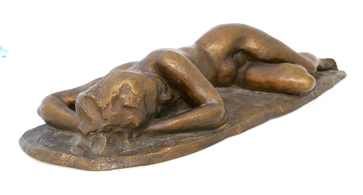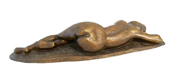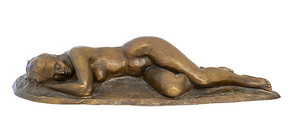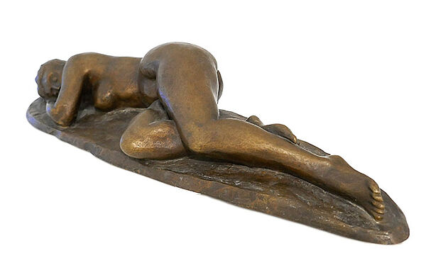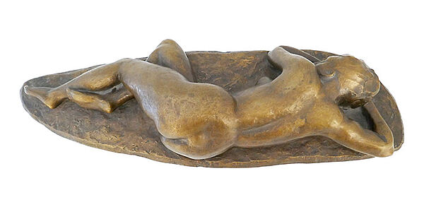 Bronzekorpus, goldbraun patiniert: vollplastische Darstellung eines liegenden bzw. schlafenden weiblichen Aktes auf annähernd ovaler Naturplinthe. Hier signiert und datiert (19)"65". Maße: Länge ca. 57 cm, Breite ca. 18,5 cm, Höhe ca. 11 cm, geringe Altersspuren.