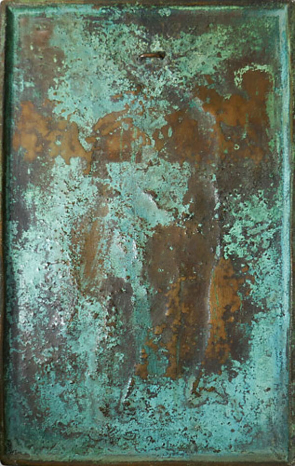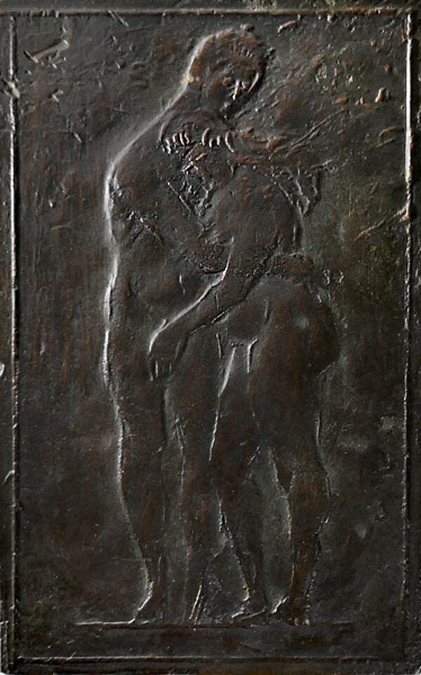 Hochrechteckige Bronzeplatte, vorderseitig braun patiniertes Flachrelief eines stehenden, nackten Liebespaares. Maße ca. 21,5 x 13,5 cm, geringe Altersspuren. Rückseitig starre Öse zur Aufhängung. Wohl 1960er, 70er Jahre.
