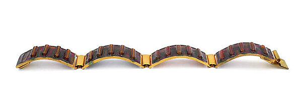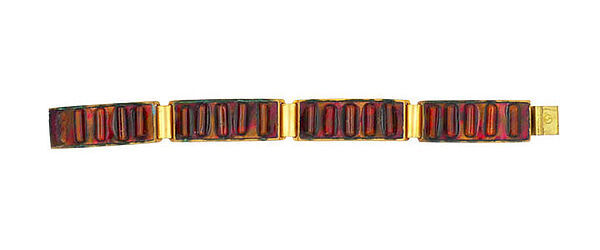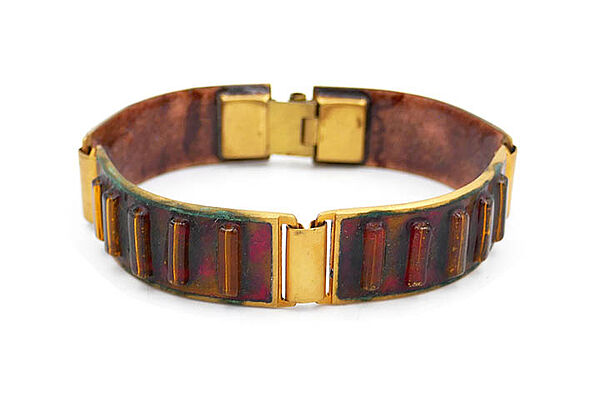 Viergliedriges Armband aus Messing oder Kupfer mit oberseitgem strukturierten Emaille-Dekor in Rotbraun, rückseitg einfache Gegenemaillierung in gleicher Farbe. Zungenförmiger Federverschluss. Länge ca. 18 cm, minimale Tragespuren. Innenseitig gemarkt. Wohl 60er Jahre.
