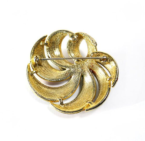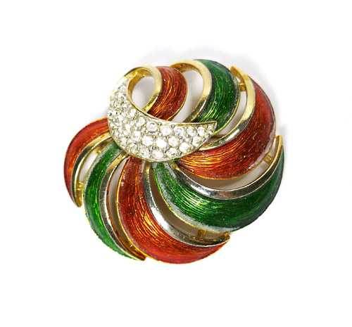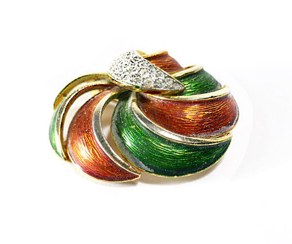 Fächerförmiger, an Blätter oder Federn erinnernder, offen gearbeiteter Metallkorpus (Messing vergoldet ?), abwechselnd rot / grün emailliert, zudem Straßbesatz; Durchmesser ca. 5,5cm, geringe Tragespuren. Rückseitig Sicherheitsbroschierung mit Kugelkopf. Ungemarkt, evtl. USA der 50er, 60er Jahre.