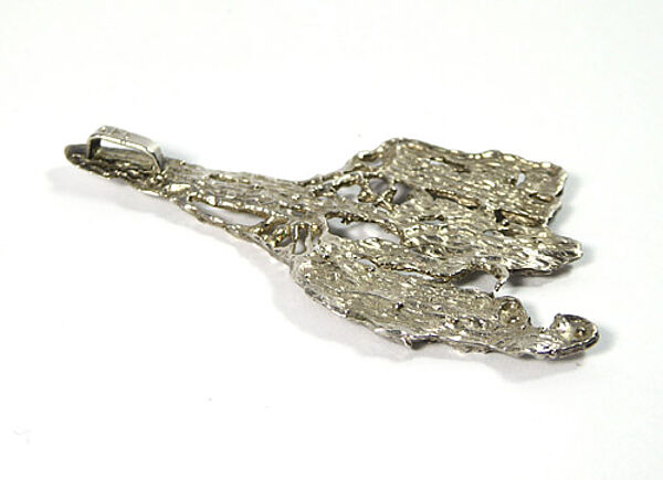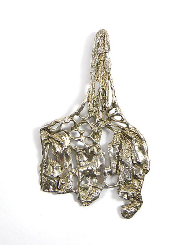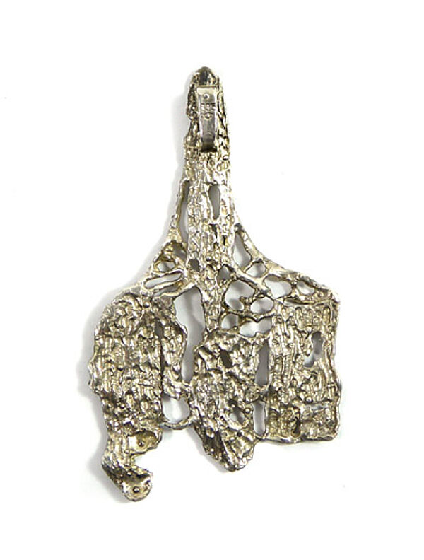 Abstrakt-amorpher Silberkorpus (835er), der ein Stück weit an die Formen erinnert, die beim Zinn- oder Bleigießen enstehen. Maße ca. 7,1 x 4 cm, ungeputzter Zustand mit diskreter Patina und geringen Tragespuren. Rückseitig starre Öse und Markung. Wohl 1960er, 70er Jahre.