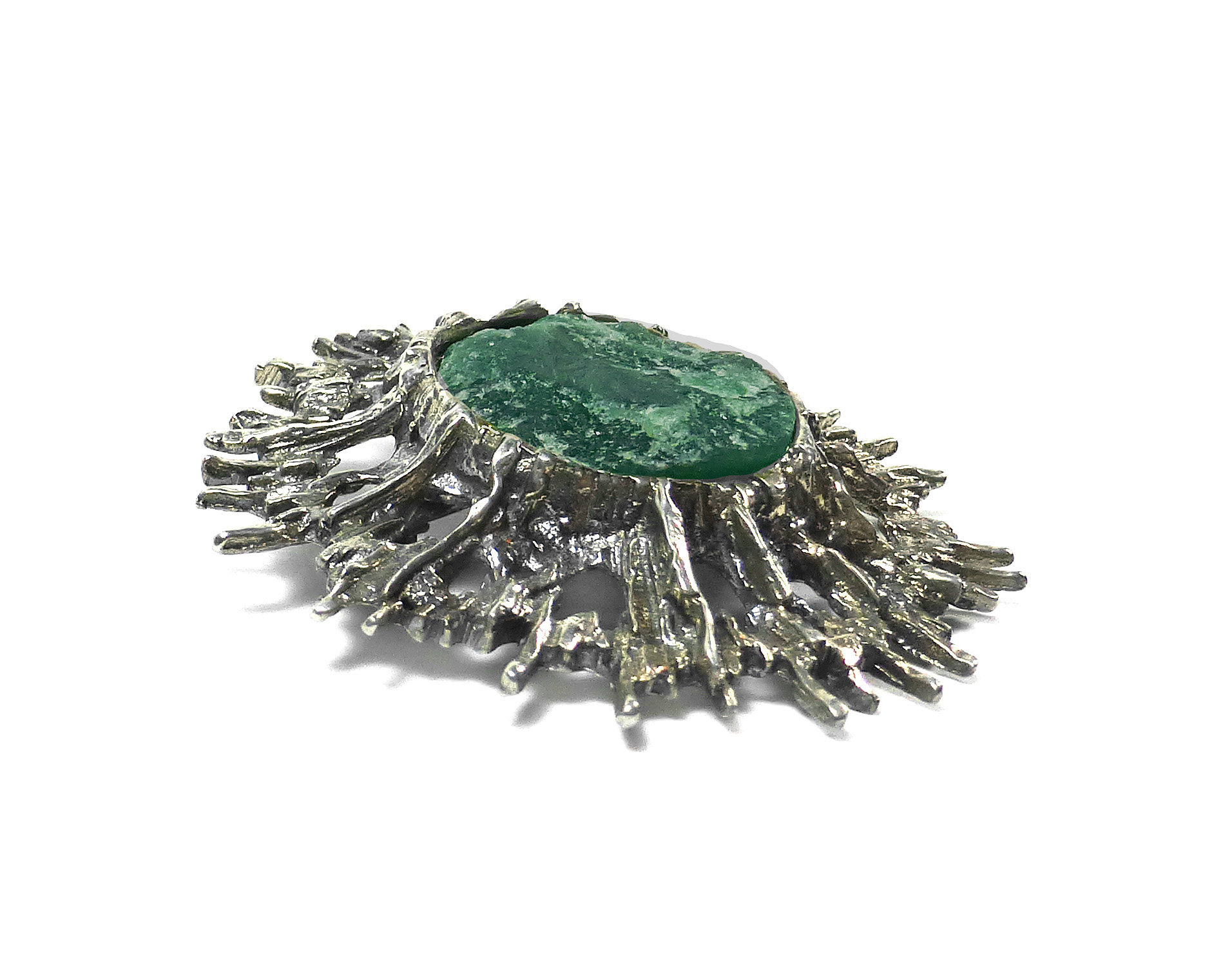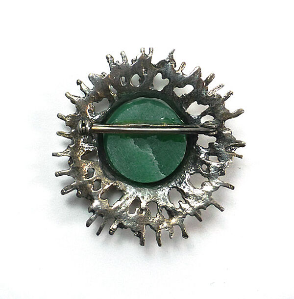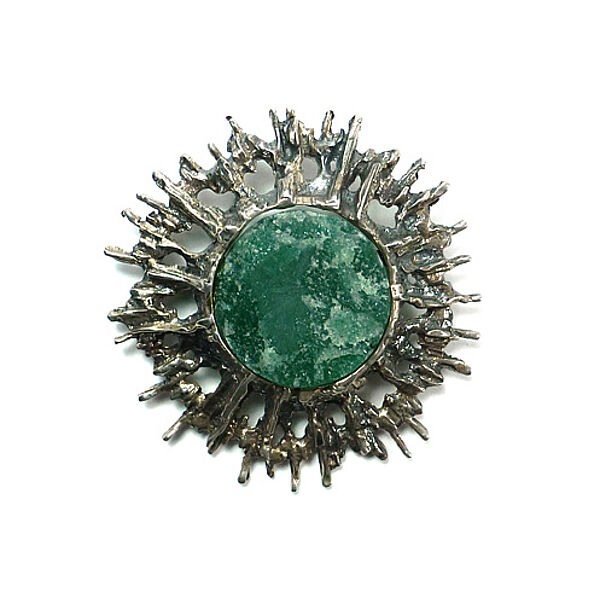 In der Form an eine Sonne oder Blüte erinnernder Silberkorpus (835er) der zentral eine unbeschliffene grüne Steinscheibe (vermutlich grüner Granat) mit unbehandelter Oberfläche integriert. Broschendurchmesser ca. 4,5 cm, Steindurchmesser ca. 2 cm, ungeputzter Zustand mit leichter Patina und geringen Tragespuren. Rückseitig Sicherheisverschluss mit Kugelkopf. Ungemarkt, wohl Deutschland der 1960er, 70er Jahre.