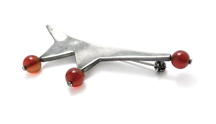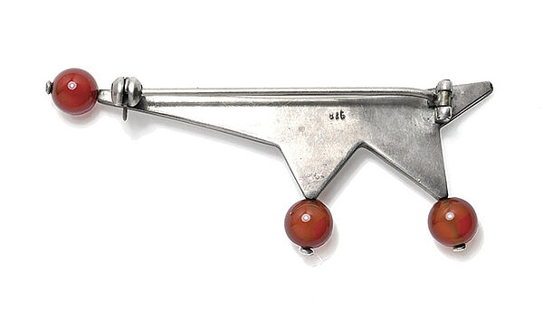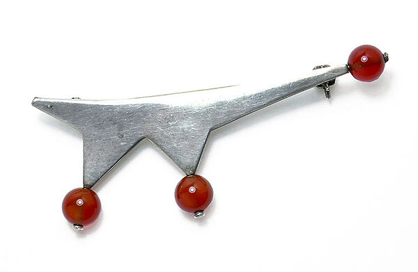 Silberner Korpus (935er), der aus einer flachen, leicht ungleichmäßig konkav gewölbten Platte besteht, die in vier unterschiedlich große Spitzen ausläuft, wovon die beiden unteren und die linke eine Karneolperle tragen. Hierdurch entsteht der Eindruck eines stark stilisierten Tieres. Maße ca. 6 x 2 cm, ungeputzter Zustand mit leichter Patina und geringen Tragespuren. Rückseitig Sicherheitsbroschierung mit Kugelkopf. Ungemarkt, wohl Deutschland der 1960er Jahre.