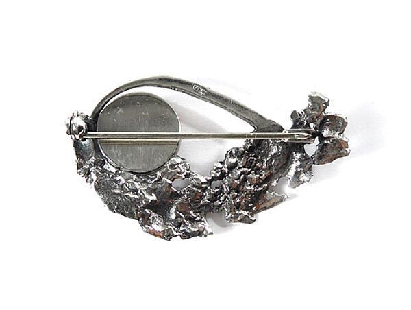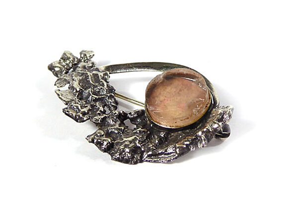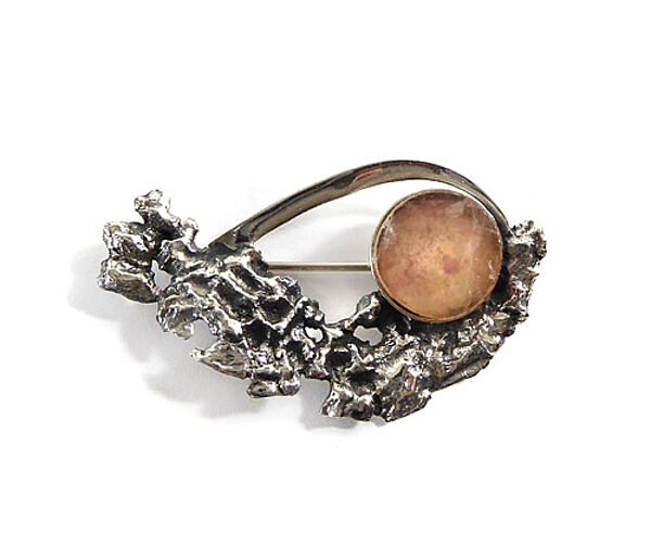 Silberner Korpus (925er), der überwiegend amorph bzw. porös-gesteinsartig wirkt und am oberen Rand ein bogenförmes Band sowie am rechten Rand eine vorderseitig ungeschliffene Rosenquarzscheibe in Zargenassung integriert hat. Maße ca. 4,5 x 3 cm, ungeputzter Zustand mit leichter Patina und geringen Tragespuren. Rückseitig Sicherheitsbroschierung mit Kugelkopf. Wohl Deutschland der 1970er Jahre.
