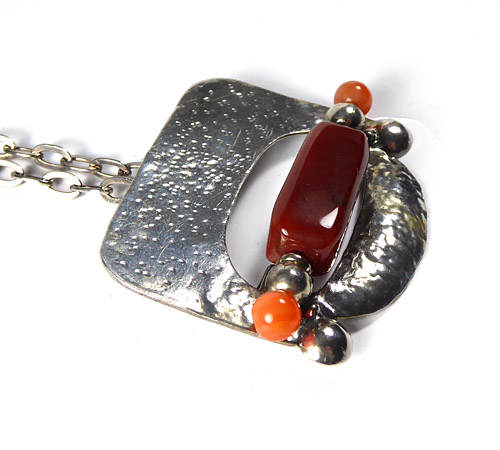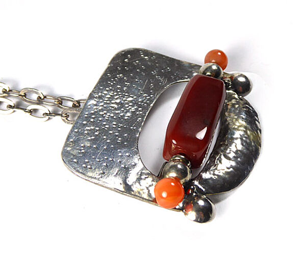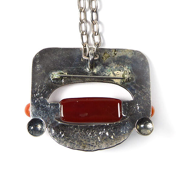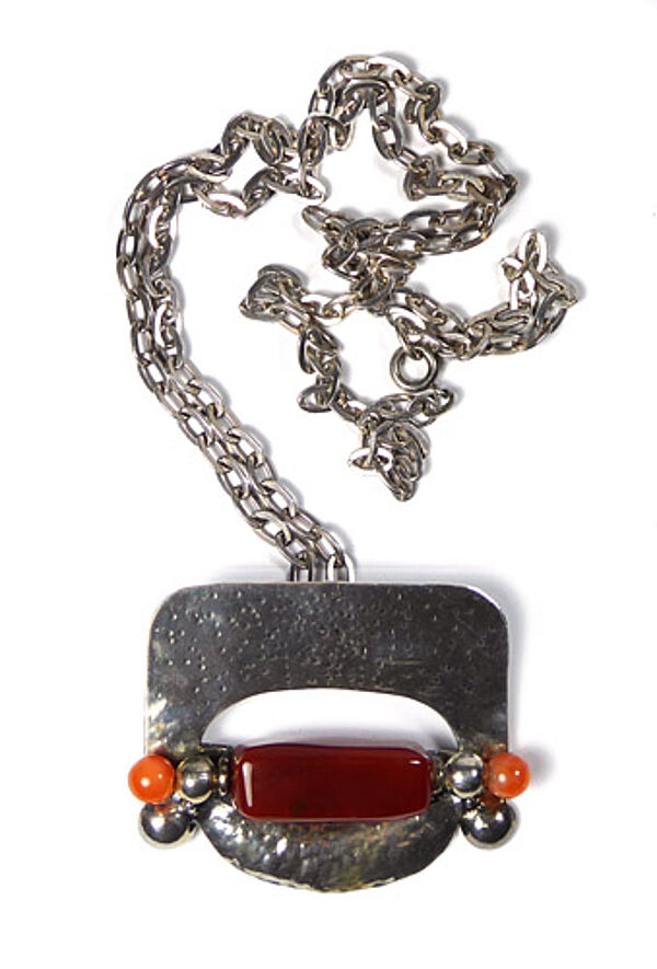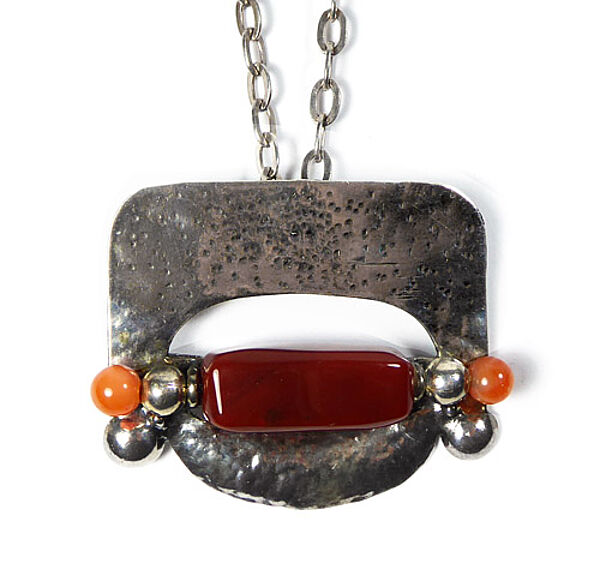 Handgearbeiteter Silberkorpus (925er), der als Anhänger sowie als Brosche zu tragen ist und aus mehreren Elementen besteht: oben dominiert eine bizarr gepunzte Platte, mittig befindet sich eine schlitzförmige Öffnung, an deren Unterrand ein länglicher Schmuckstein (wohl Karneol) und seitlich jeweils eine orange-farbene Schmuckstein-Perle und zwei Silberkügelchen fixiert sind, der unteren Anteil wird durch ein fein getriebenes, leicht konvexes, sichelförmiges Element gebildet. Länge mit langer Kette (diese 835er) ca. 68,5 cm, Ringösenverschluss. Maße des Anhängers ca. 5,4 x 4,3 cm, ungeputzter Zustand mit leichter Patina und geringen Tragespuren. Rückseitig starre Anhängeröse und einfache Broschierung sowie ungedeutete Markung. Wohl Deutschland der 1960er, 70er Jahre.