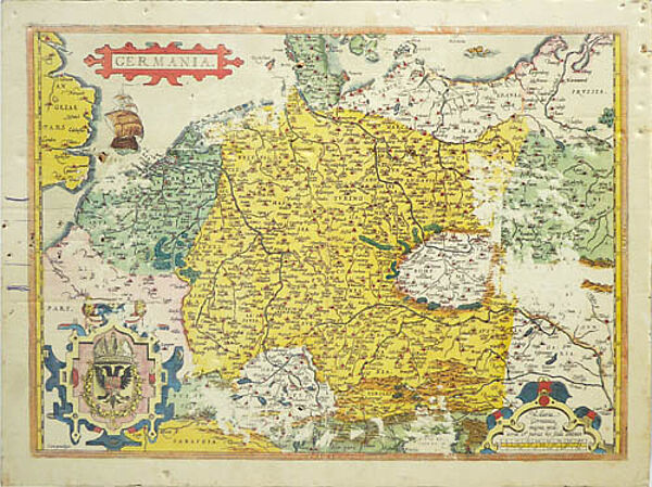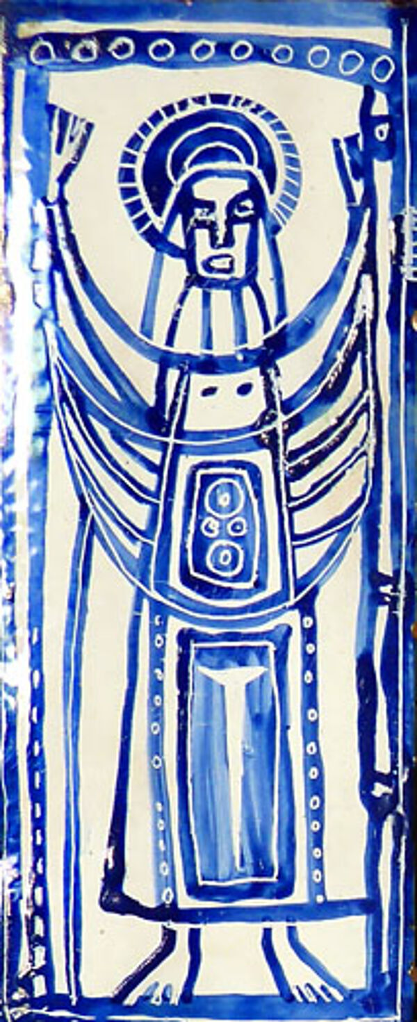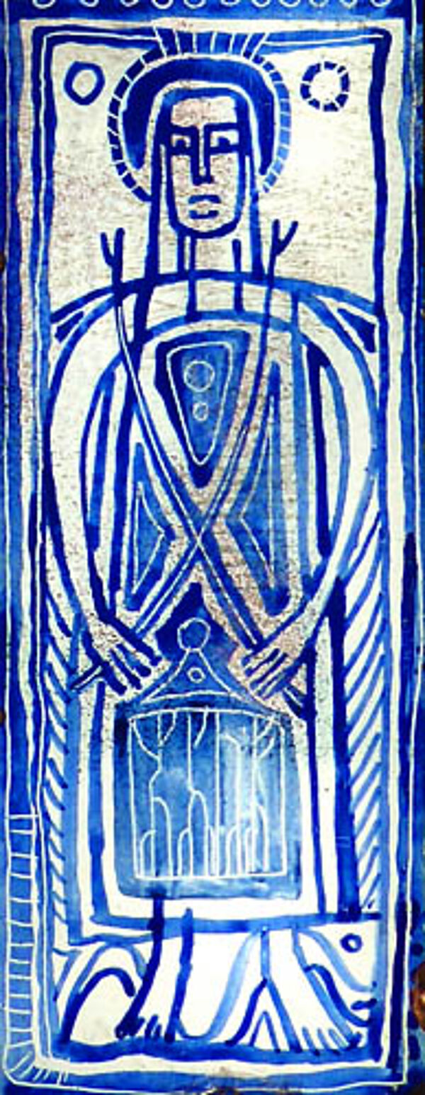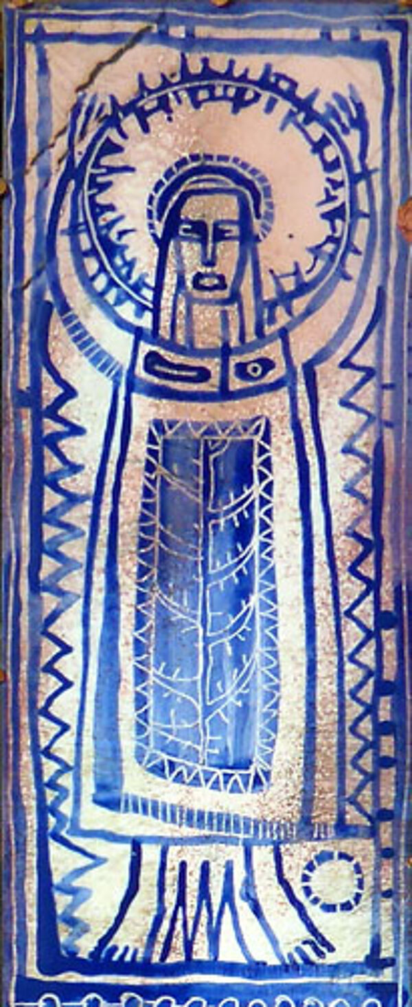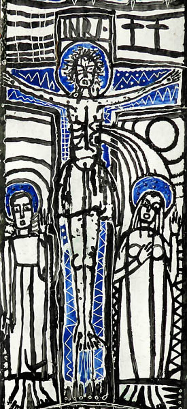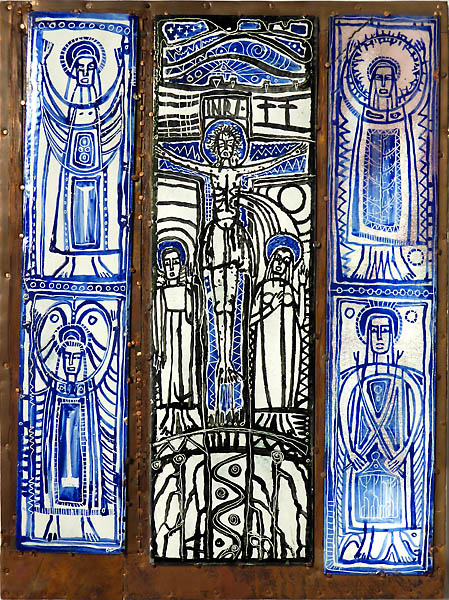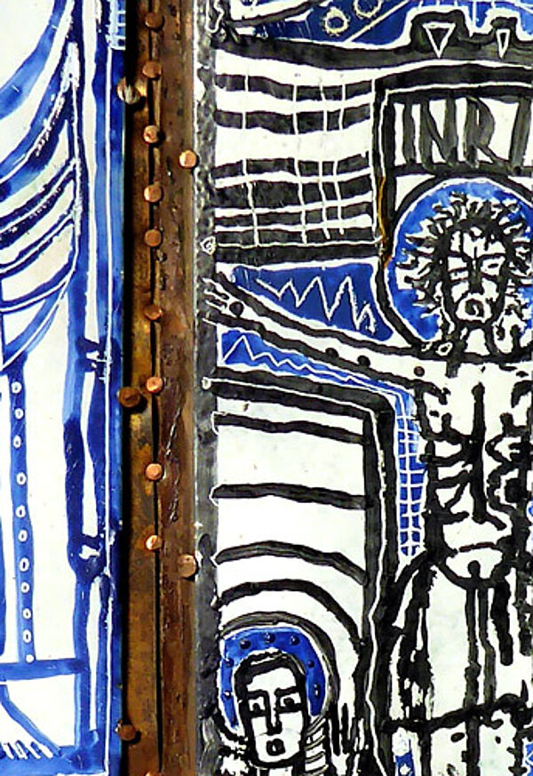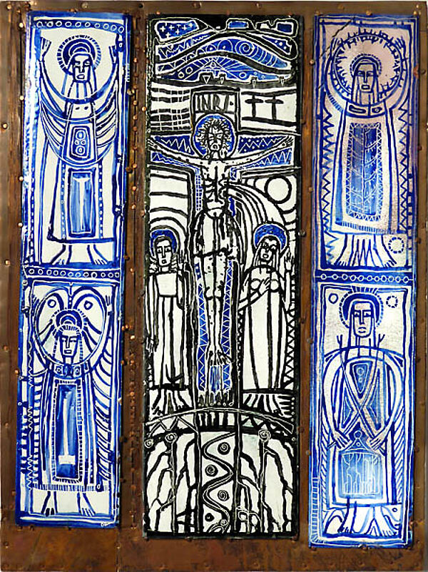 Der Schrein besteht aus drei länglichen Emailleplatten mit expressiver Malerei in vorwiegend Blau-, z.T. auch Schwarztönen auf weißen Grund. Mittig, auf der größten Platte, ist die Kreuzigungsszene dargestellt, seitlich je zwei Heilige. Die Platten sind mit Kupfernägeln auf einem dünnen Kupferblech fixiert, welches wiederum auf einer dicken Spanplatte aufgebracht ist. Bildaußenmaße ca. 55,5 x 41 cm, linker Bildstreifen ca. 49 x 10 cm, mittlerer Bildstreifen ca. 50 x 14,7 cm, rechter Bildstreifen ca. 51 x 10 cm, rückseitig aufgezogene alte Karte "GERMANIA". Geringe Altersspuren. Unsigniert und undatiert, wohl 1960er Jahre.