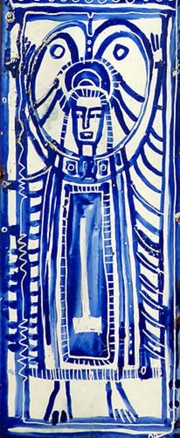 Expressives, wie ein Altar angelegtes Bild aus bemalten Emailleplatten
