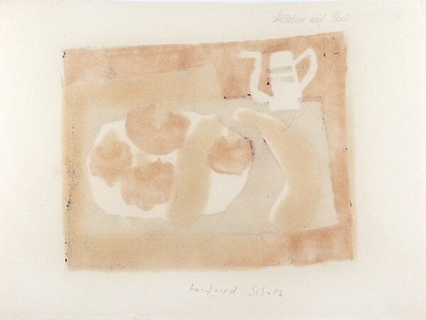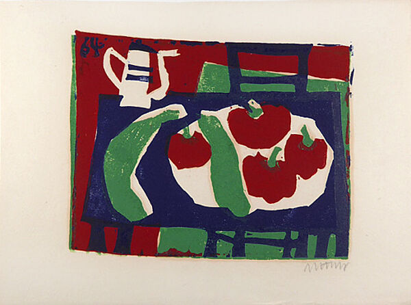 Farbiger Linolschnitt: ohne Titel ("Stilleben auf Tisch")