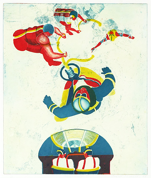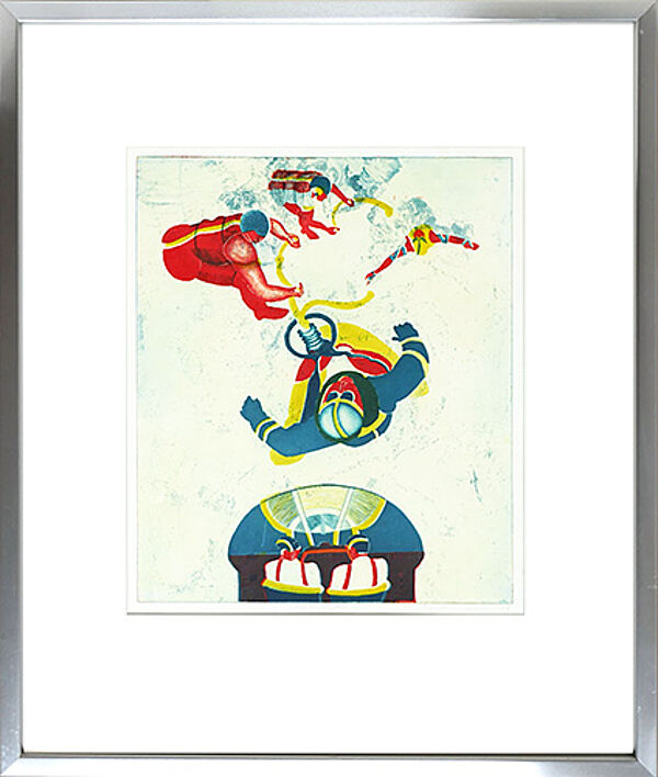 Farbige Radierung auf fast weißem, relativ kräftigen Papier. Unterhalb der Darstellung handschriftlich betitelt, signiert und datiert in Blei "Astronauten IV, Ingrid Schroeder (19)65". In den unteren Ecken handschriftliche Vermerke in Blei. Blattmaße ca. 62,5 x 54,5 cm, Maße der Darstellung ca. 39,0 x 33,0 cm, Außenmaße der neueren, silber gefassten Holzleiste ca. 69 x 58 cm. Geringe Lager-, Griff- und Altersspuren. Lebensdaten der Künstlerin unbekannt.