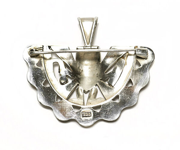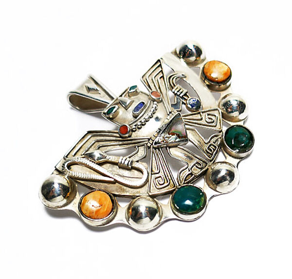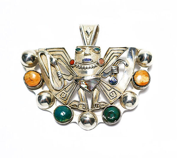 Aufwendig handgearbeiteter, flach plastischer, teilweise durchbrochener Silberkorpus (950er) mit figürlichem Maya- oder Inka-Motiv. Im Randbereich sind gelbe und grüne gemuggelte Schmucksteine in Zargenfassung integriert, mittig ein dreieckiges Stück Permutt. Oberseitig scharnierte, bewegliche, dreieckig konfigurierte Öse, rückseitig einfache Broschierung, so dass das Schmuckstück als Anhänger und als Brosche tragbar ist. Breite ca. 6 cm, Höhe mit Anhängeröse ca. 5 cm, geputzter zustand mit geringen Tragespuren. Ungemarkt, evtl. Mexiko der 1950er bis 70er Jahre.