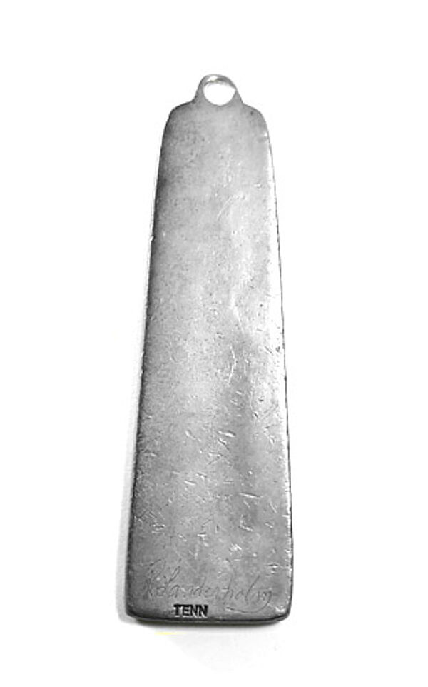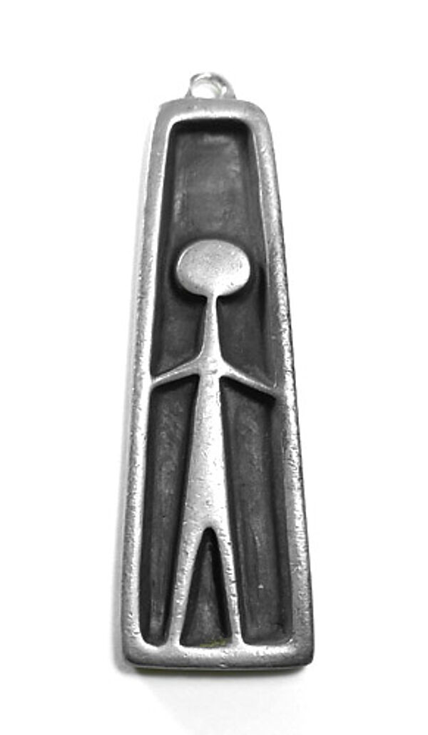 Kräftiger, länglicher, sich nach oben leicht verjüngender Zinnkorpus, der vorderseitig ein akzentuiertes Relief eines stark stilisierten Menschen im Rahmen zeigt. Oberseitig starre Anhängeröse. Hintergrund dunkel patiniert. Maße ca. 7,2 x 2,2 cm, geringe Tragespuren. Rückseitig Markung, wohl 1960er Jahre. Dazu neuzeitliches, unbehandeltes, helles Schweinslederband.