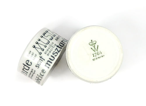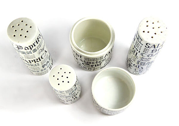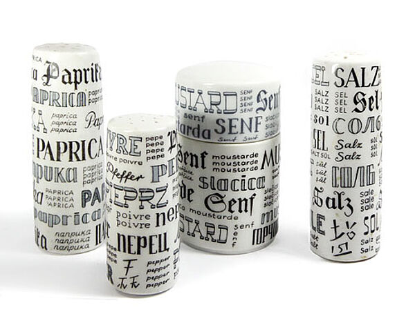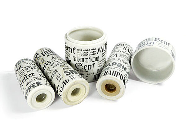 Jeweils zylindrische Porzellankorpi, bestehend aus zwei Streubehältern für Salz und Paprika (Höhe ca. 8,9 cm), ein Streubehälter für Pfeffer (Höhe ca. 6,7 cm), eine Deckeldose für Senf (Höhe ca. 7,8 cm, Durchmesser ca. 4,8 cm). Außenseitig typografisches Dekor, jeweils das entsprechende Gewürz in verschiedenen Sprachen und Schriften wiedergebend. Unterseitig dreimal Kunststoffpropfen als Verschluss, einmal Markung (Senftopf). Geringe Gebrauchsspuren. Wohl Anfang der 1960er Jahre.