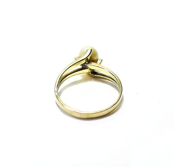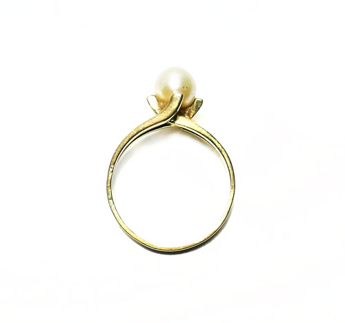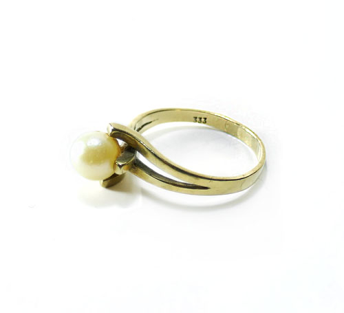 Goldener (333er), im vorderen Teil geschlitzter Reif, dadurch entstanden jeweils zwei Endstücke, die so ineiander greifen bzw. miteinander verflochten sind, dass sie die Halterung für eine Zuchtperle bilden. Ringdurchmesser ca. 17 mm, geringe Tragespuren. Wohl 1960, 70er Jahre.