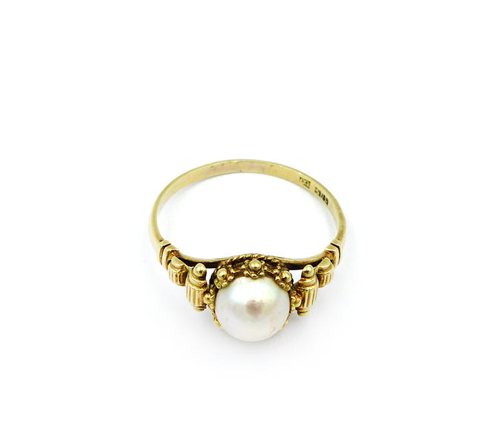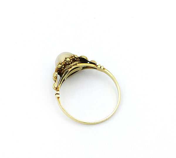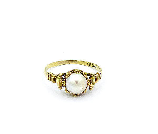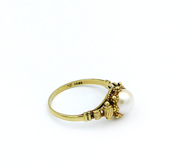 Korpus aus 585er Gold: einfache Ringschiene, im Schulterbereich beidseits Rollen- und stilisierte Blüten-Elemente, letztere umlaufen auch die mittige Zuchtperle. Innendurchmesser ca. 17,5 mm. Gewicht ca. 3 Gramm. Die Perle weist leichte Gebrauchsspuren auf, ansonsten eher geringe Tragespuren. Innenseitig ungedeutete Markung. Wohl Deutschland der 1920er Jahre.
