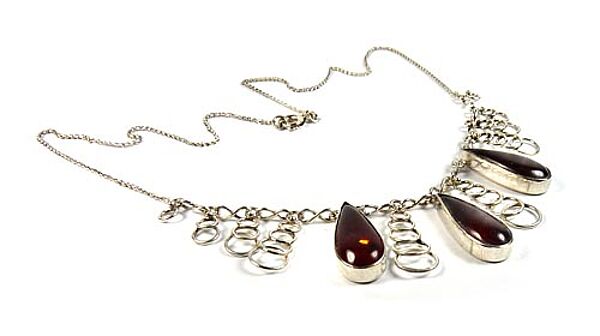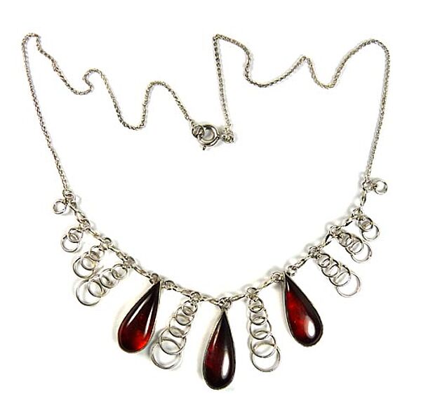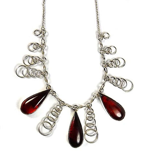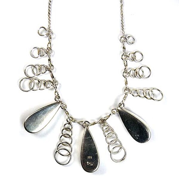 Collier aus 333er Weißgold, im zentralen Teil sind drei tropfenförmig gemugelte, braune, luzide Bernsteine in Zargenfassung abgehängt, zudem 10 girlandenartige Elemente aus sich überlagernden Ringen, die zur Mitte einen Größenverlauf aufweisen. Ringösenverschluss. Länge ca. 42 cm, geputzter Zustand mit geringen Tragespuren. Gemarkt, wohl 60er Jahre.