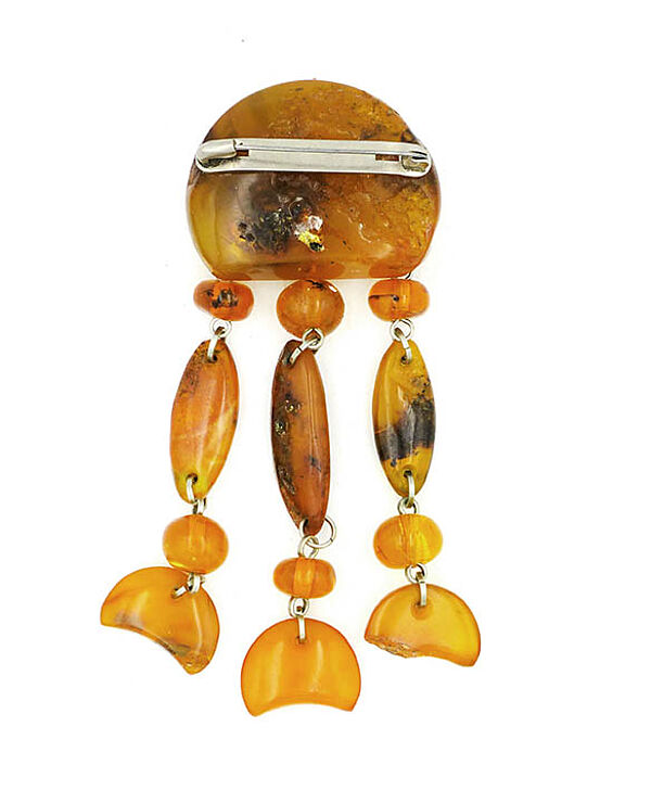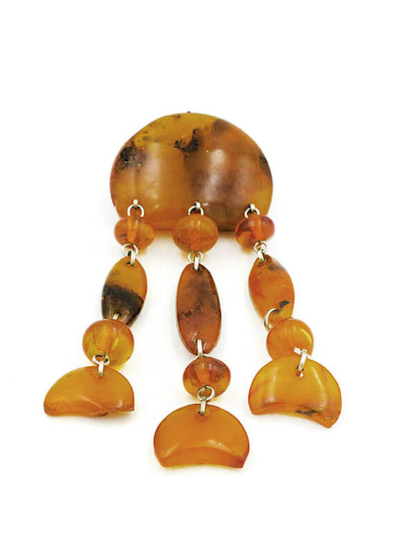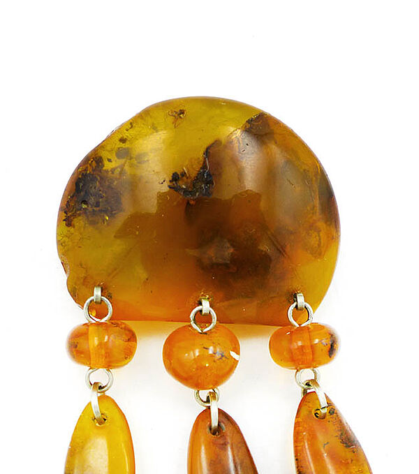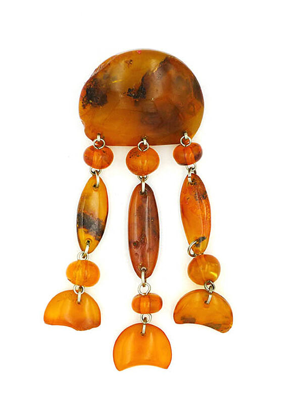 Der Korpus wird durch einen annähernd halbrund gemugelten, braunen, semiluziden Bernstein dominiert, unterseitig sind hier drei Ketten abgehängt (die kleinen Glieder sind aus unedlem Metall), die jeweils vier, ebenfalls bräunliche, luzide Bernsteinen in unterschiedlicher Form tragen. Länge ca. 10 cm. Breite ca. 4 cm. Geringe Tragespuren, lediglich an einem der abgehängten, kleineren Bernsteine kann man eine kleine Fehlstelle erkennen, siehe Photo. Rückseitig einfache, aufgeklebte Broschierung aus unedlem Metall. Ungemarkt, wohl Deutschland der 40er bis 60er Jahre.