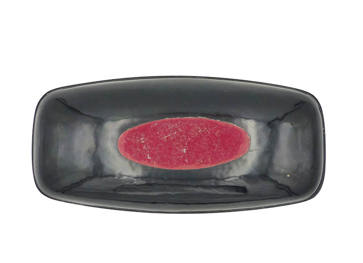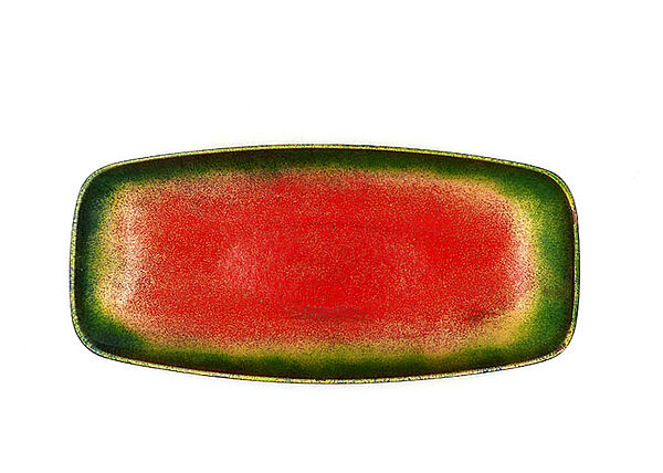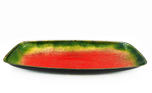 Annähernd rechteckiger, flach schalenförmiger Metallkorpus (vermutlich Kupfer) mit leicht abgerundeten Ecken und diskret konvex verlaufenden Längskanten. Unterseitig monochrom schwarz emailliert, an der Standfläche mit dünner Filzplatte beklebt. Oberseitig dominiert der leuchtend rot emaillierte Grund, der zum grünen Randbereich durch ein schmales, etwas unregelmäßig Goldband abgesetzt ist. Maße ca. 30 x 14 cm, kleine Fehlstelle am Rand, ansonsten geringe Alters- und Gebrauchsspuren. Ungemarkt, wohl (Ost-)Deutschland der 1960er, 70er Jahre.