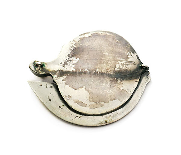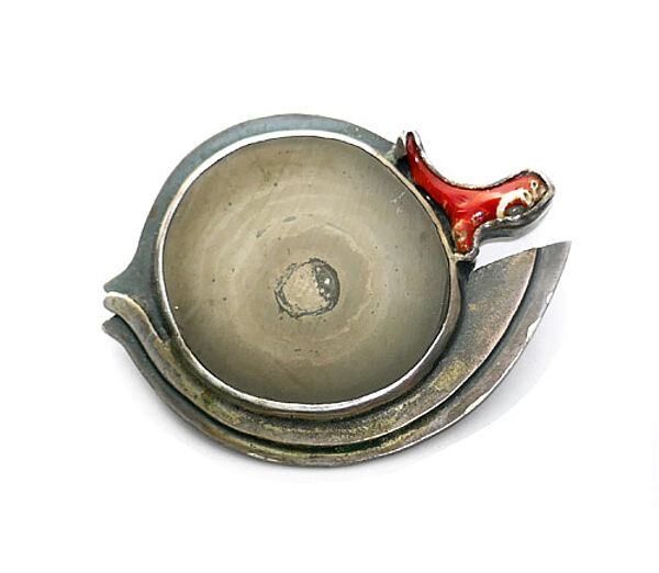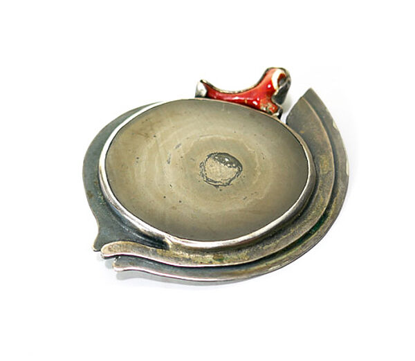 Flacher, rundlicher relativ großer Silberkorpus (925er), mittig ist eine erdig-sandfarbene, den Korpus dominierende Schmucksteinscheibe (vermutlich Achat) in Zargenfassung integriert, umgeben von einem asymmetrisch ausgeprägten, auf der einen Seite schmalen, einfachen und auf der anderen Seite recht dominanten, zweietagigen, flachen Steg. Im unteren Anhänger-Anteil befindet sich ein leuchtend roter Korallenast, mit einem flachen Silbersteg ummantelt. Maße ca. 7 x 6 cm, geringe Tragespuren mit moderater Patina. Rückseitig einfache, starre Anhängeröse sowie ungedeutete Markung: ligiertes "TH". Wohl Deutschland der 1960er, 70er Jahre.