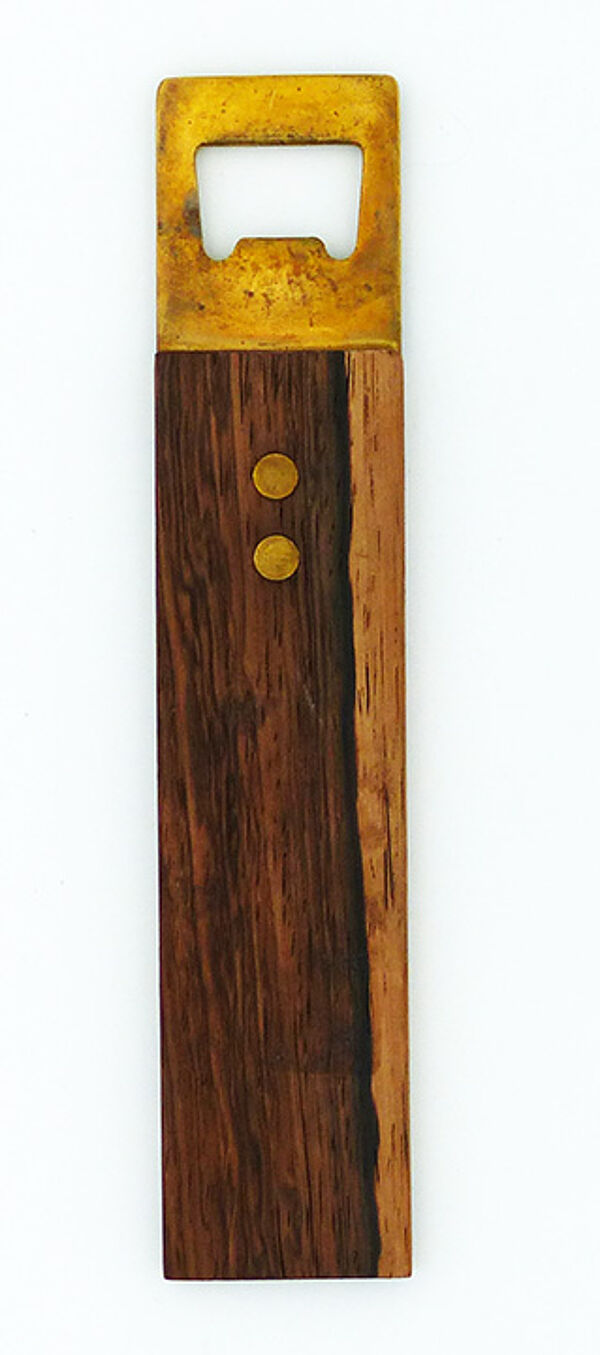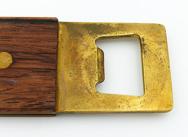 Langer, flacher, rechteckiger Messing- oder Bronzekorpus mit dunkelbraun gebeiztem Holzgriff, der im oberen Drittel mit zwei Nieten befestigt ist. Maße ca. 19cm x 3,5cm, ungeputzter Zustand mit z.T. deutlicherer Patina und geringen Gebrauchsspuren. Wohl Dänemark der 1960er, 70er Jahre.