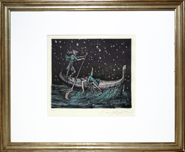 Vernis mou, Strichätzung und Aquatinta, handkoloriert, auf leicht chamoistonigem Papier. Rechts unter der Darstellung handsigniert, links auflagenbezeichnet "43/90". Plattenmaße ca. 25,5 x 29,1 cm, Blattmaße ca. 63 x 48 cm, minimal gebräunt und fleckig.