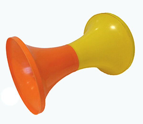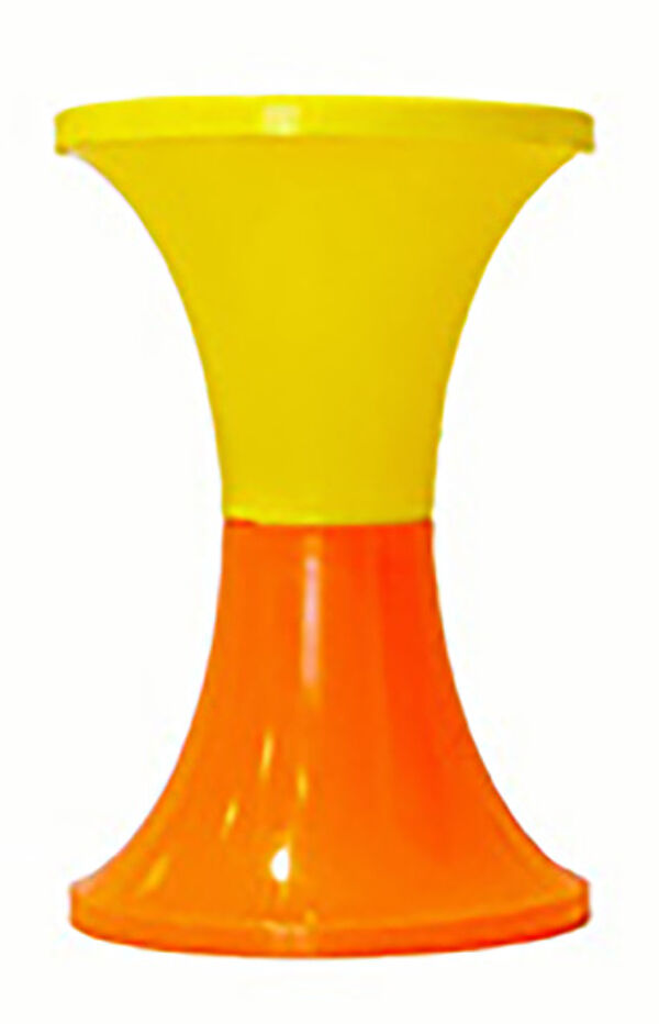 In der unteren Hälfte orangefarbener, in der oberen Hälfte leuchtend gelber, hohler, in der Draufsicht runder, über die gesamte Höhe deutlich taillierter Kunststoffkorpus. Gelber scheibenförmiger, abnehmbarer Deckel. Höhe ca. 45,5 cm, oberer Durchmesser ca. 30,5 cm, unterer Durchmesser ca. 30 cm, moderate Alters-, so z.T. einige Fleckspuren. 1970er Jahre.