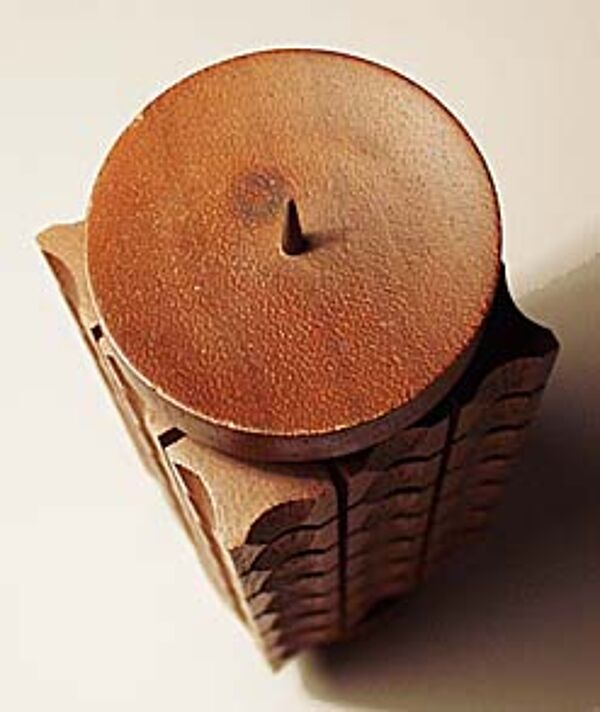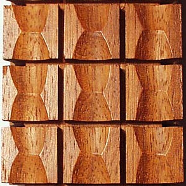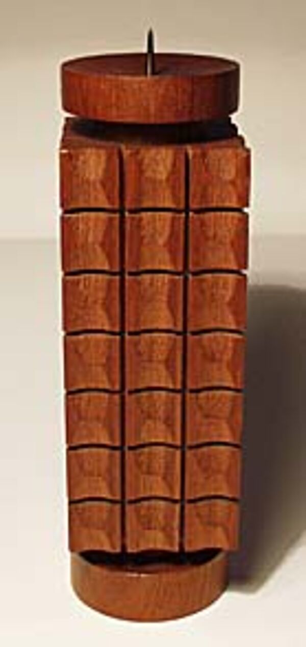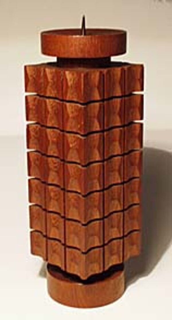 Der im Hauptteil kubische Korpus aus rötlich-braunem Holz ist horizontal und vertikal geschlitzt, so daß ein Gitterdekor entsteht, zudem weist die Oberfläche kleine muldenförmige Vertiefungen auf. Fuß und Tropfschale sind scheibenförmig, kleiner Messingdorn. Höhe ca. 19 cm, minimale Gebrauchsspuren. Wohl Deutschland oder Skandinavien der 70er Jahre.