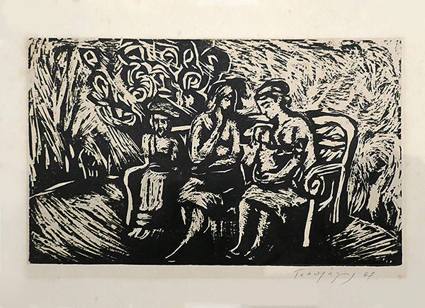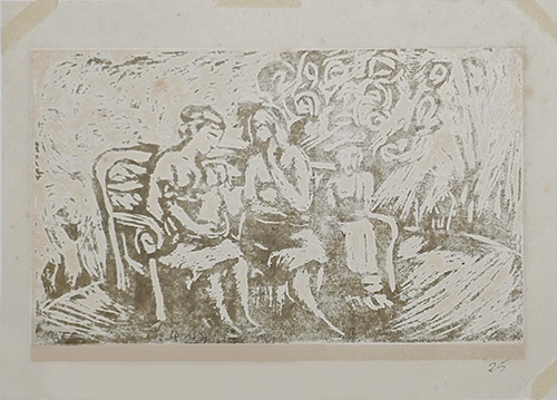 Holzschnitt: ohne Titel (Menschen - wohl Mütter - auf einer Bank im Park oder Garten)