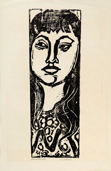 Holzschnitt auf leicht chamoistonigen Papier, rechts unter der Darstellung mit Bleistift handsigniert, links bezeichnet "Handdruck". Maße der Darstellung ca. 42,5 x 14 cm, Blattmaße ca. 49,5 x 32 cm, geringe Altersspuren, so ist das Papier leicht braunspurig, kleiner Einriss am oberen Rand. Wohl 1950er, 60er Jahre.