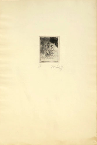 Kaltnadelradierung auf kräftigem, chamoistonigem Papier, rechts unter der Darstellung mit Bleistift handsigniert und datiert (19)"76", links auflagenbezeichnet "1/8". Plattenmaße ca. 7 x 5,3 cm, Blattmaße ca. 37,5 x 24,5 cm, geringe Alters-, Griff- und Lagerspuren, insbesondere im Bereich der Ecken, siehe Foto.