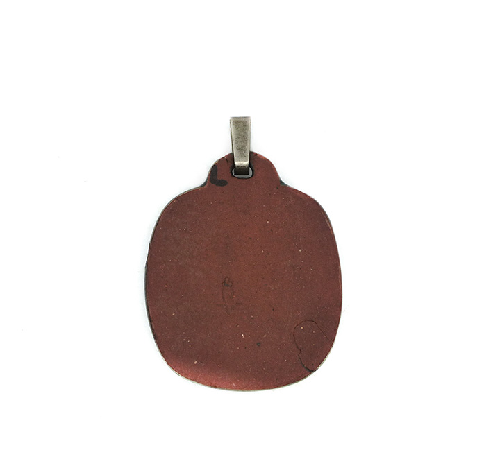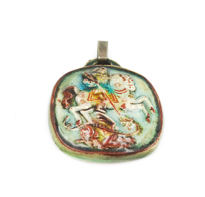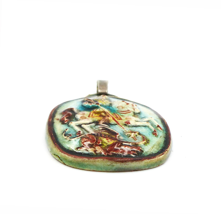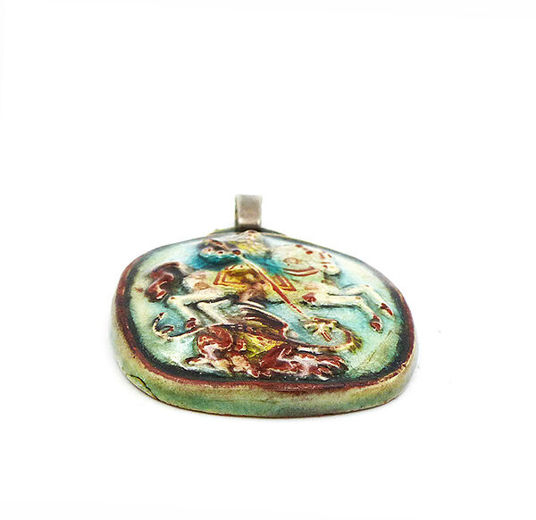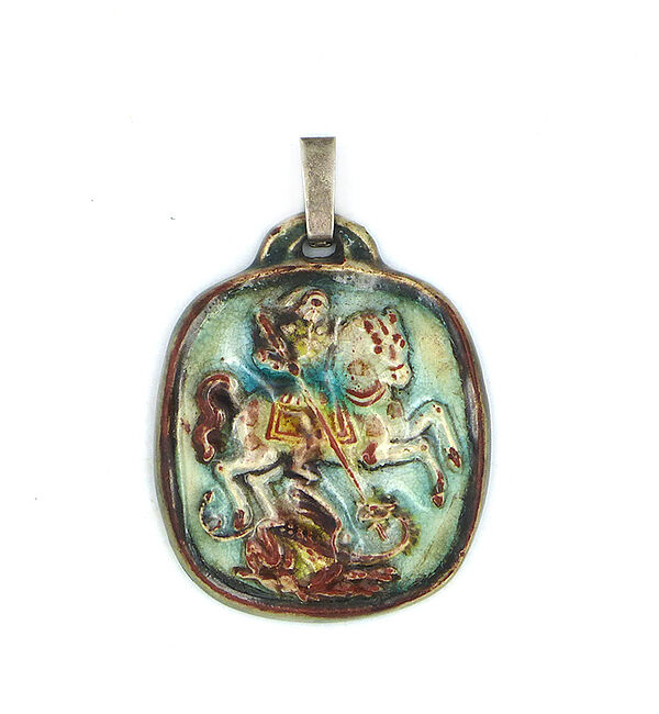 Der Korpus ist eine hochrechteckige Platte aus braunem Scherben mit abgerundeten Ecken, vorderseitig Flachrelief mit der Darstellung des berittenen Heiligen Georg, der mit der Lanze den Drachen tötet. Polychrom handglasiert. Oberseitig flache, starre Kermiköse, die eine bewegliche, silberfarbene, längliche Metallöse trägt. Maße ca. 5 x 4 cm, geringe Tragespuren. Rückseitig gepresste Markung. Wohl 1950er bis 60er Jahre.