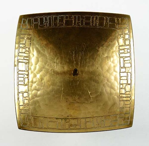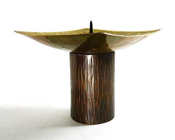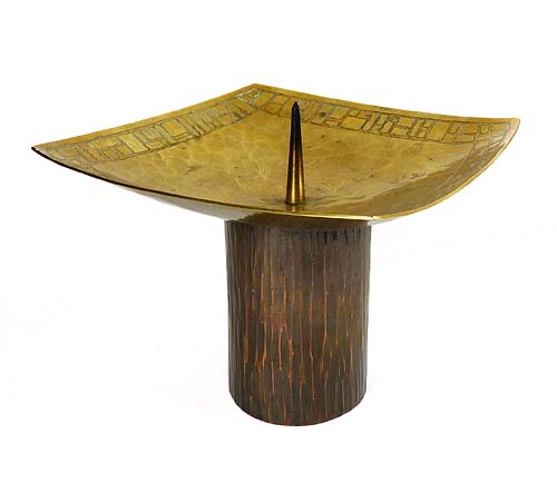 Der handgearbeitete Korpus setzt sich aus einem zylindrischen Fuß aus gerieften Kupferblech und einer in der Grundform quadratischen, flach gemuldeten, getriebenen Messingschale zusammen, die im Randbereich ein flach reliefiertes, wohl geätztes, abstraktes Band-Dekor aufweist. Mittig kräftiger Dorn. Höhe knapp 12 cm, ungeputzter Zustand mit z.T. dunkler Patina und moderaten Gebrauchsspuren. Wohl Deutschland oder Skandinavien der 60er, 70er Jahre.