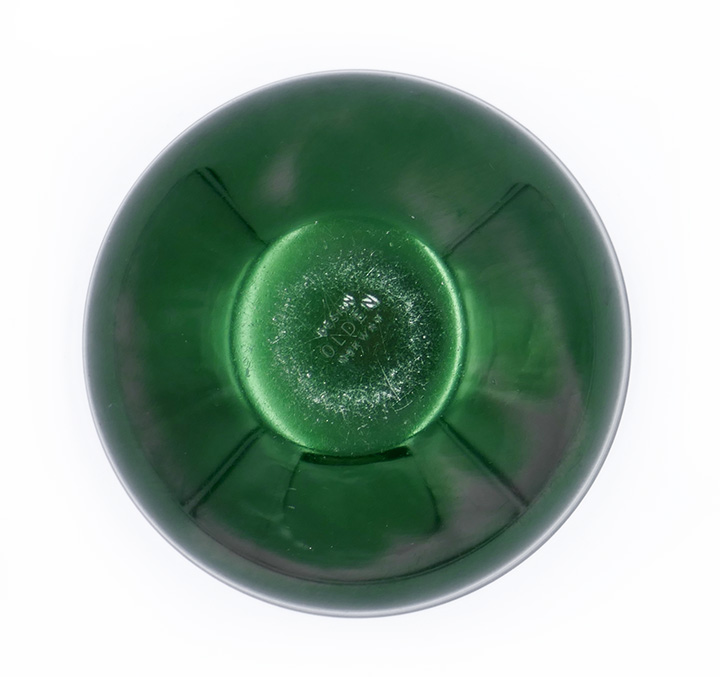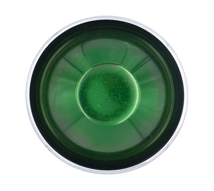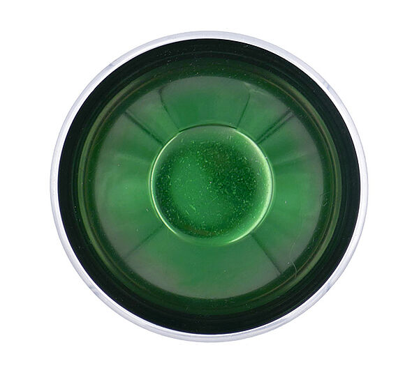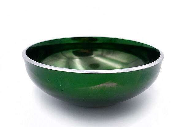 Schüsselförmiger Aluminiumkorpus auf flachem, kleinen Stand. Bis auf die Randdraufsicht ist die Schale komplett luzid grün emailliert. Durchmesser ca. 12 cm, Höhe ca. 4,5 cm, geringe Altersspuren. Unterseitig Markung. Wohl 1950er, 60er Jahre.