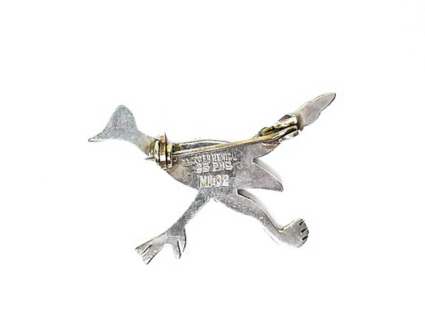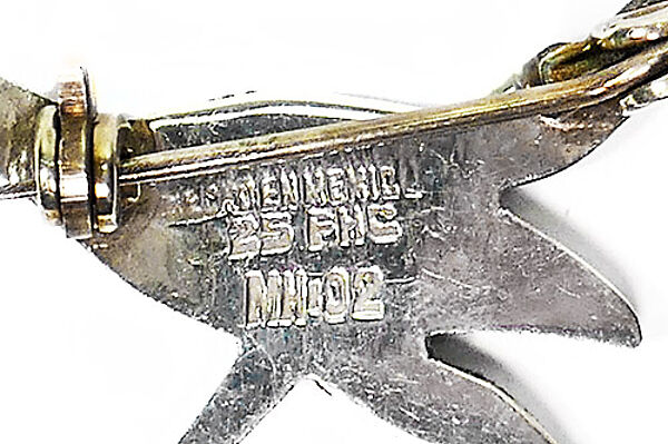 Figürlicher, flach reliefierter Silberkorpus (925er), der einen in Kreuzform leicht stilisierten, laufenden Vogel darstellt. Maße ca. 4 x 2,8 cm, leichte Patina, geringe Tragespuren. Rückseitig Sicherheitsbroschierung mit Kugelkopf sowie ungeklärte Markung. Wohl 1970er bis 90er Jahre.