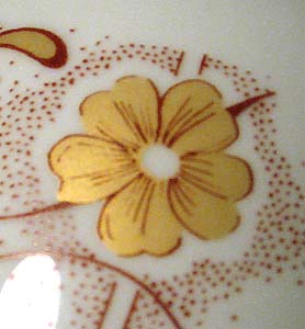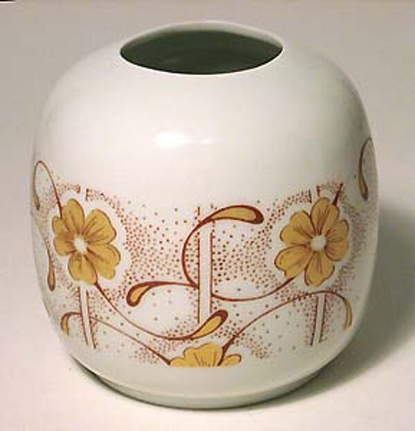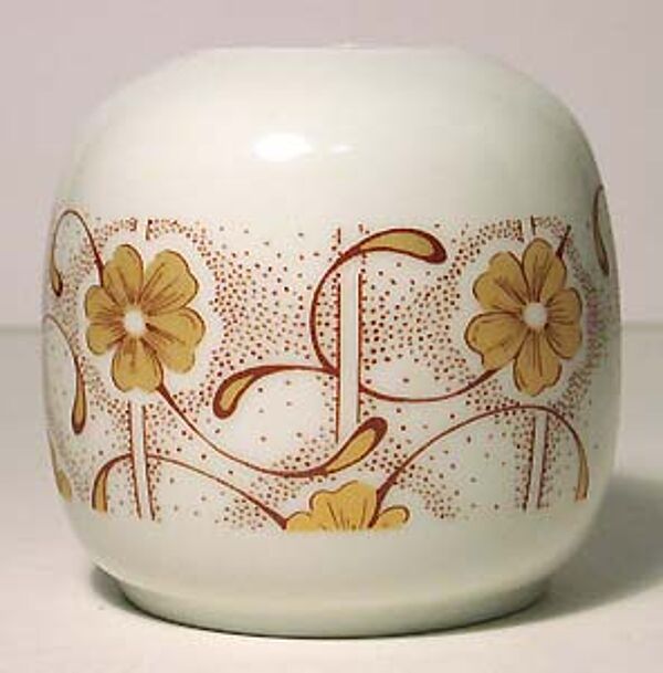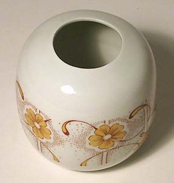 Der ovoide Korpus hat ein florales Dekor in Gold und Rotbraun, Höhe ca. 7 cm, minimale Gebrauchsspuren. Unterseitig gemarkt, wohl 70er Jahre.