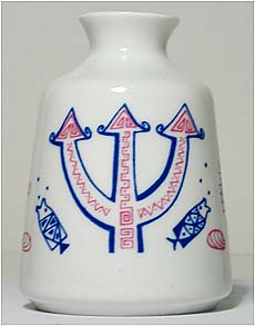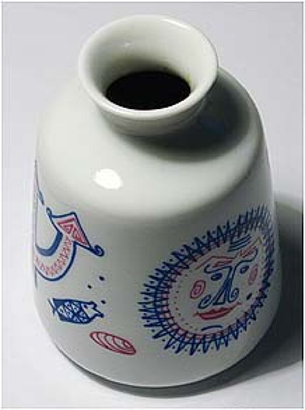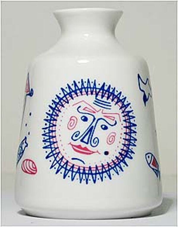 Der sich nach oben verjüngende Korpus mit akzentuiertem Hals und ausgestelltem Mündungsrand weist ein polychromes Dekor mit stilisierten maritimen Motiven bzw. wohl ein mit diesen im Zusammenhang stehendes Gesicht (Sonne?? Seemann??) auf. Höhe ca. 7,5 cm, minimale Gebrauchsspuren. Unterseitig Marke (ab 1964 verwendet) sowie Modell-Nr. 2165 bzw. 1764. Wohl Anfang der 70er Jahre.