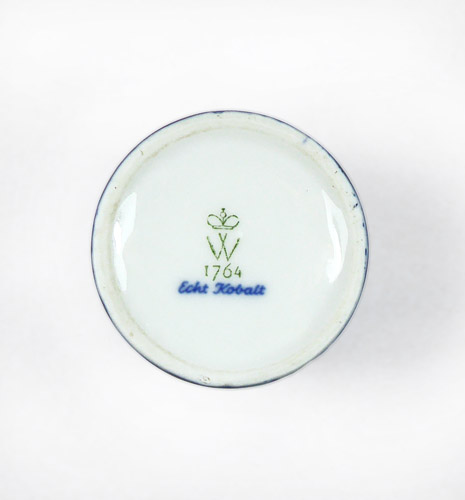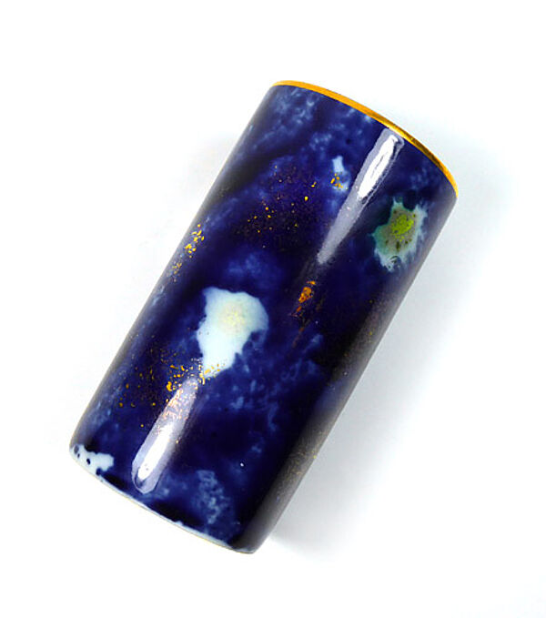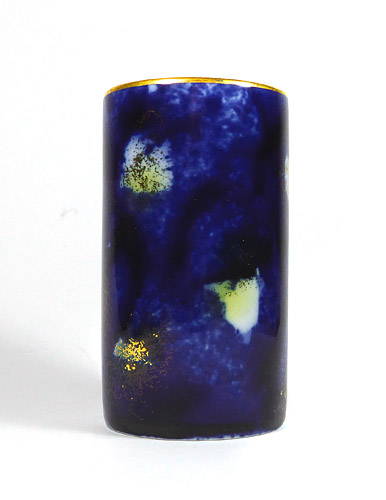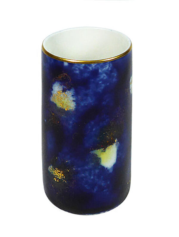 Zylindrischer Porzellankorpus mit wolkig-expressiver, überwiegend kobaltblauer, vereinzelt goldgesprenkelter, wohl handbemalter Glasur. Schmaler Goldrand. Höhe ca. 10 cm, Durchmesser ca. 5,2 cm, geringe Gebrauchsspuren. Unterseitig Markung und Bezeichnung "Kobalt", wohl 1960er, 70er Jahre.