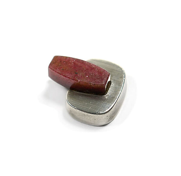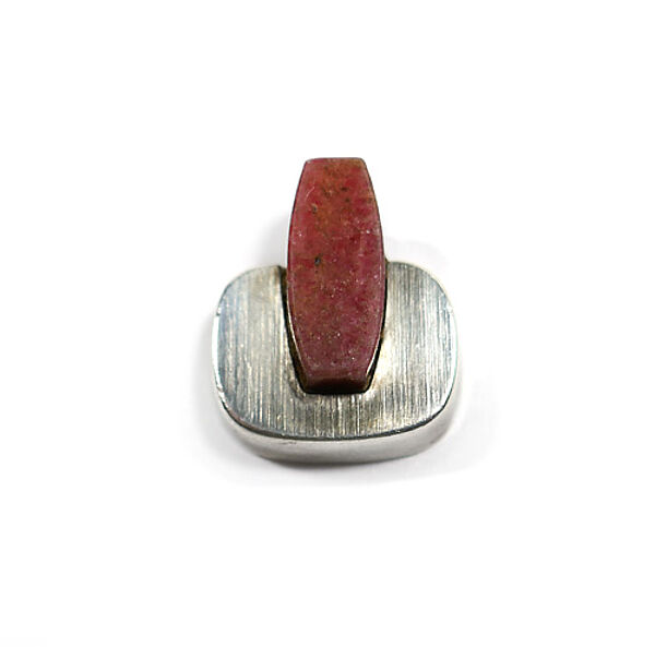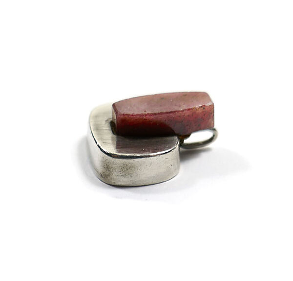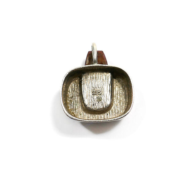 Querovaler Silberkorpus (925er) mit abgerundeten Ecken. Oberseitig, ca. zwei Drittel der Vorderfläche einbeziehend, zudem aber auch die Korpusoberkante deutlich überragender, annähernd rhombenförmiger, rötlicher Schmuckstein integriert, hinter dem die starre Anhängeröse versteckt ist. Maße ca. 1,5 x 1,3 cm, ungeputzter Zustand mit diskreter Patina und geringen Tragespuren. Rückseitig gemarkt (ungedeutet), wohl Deutschland oder Skandinavien der 1960er, 70er Jahre.