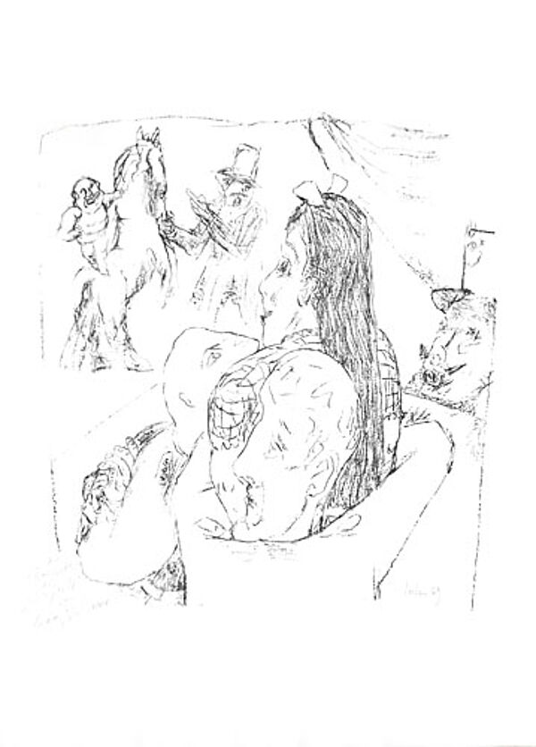 Lithografie auf Weißenborn-Bütten, rechts unterhalb der Darstellung mit Bleistift signiert und datiert (19)"69", rechtsseitig betitelt "in der Schaubude aus "Woyzeck" von Georg Büchner, Blattmaße ca. 59 x 42 cm, Bildausschnitt ca. 39 x 35 cm, eher geringe Alters,- Griff- und Lagerspuren. Insbesondere zeigt sich ein kleinerer Einriß im Bereich der rechten oberen Ecke.