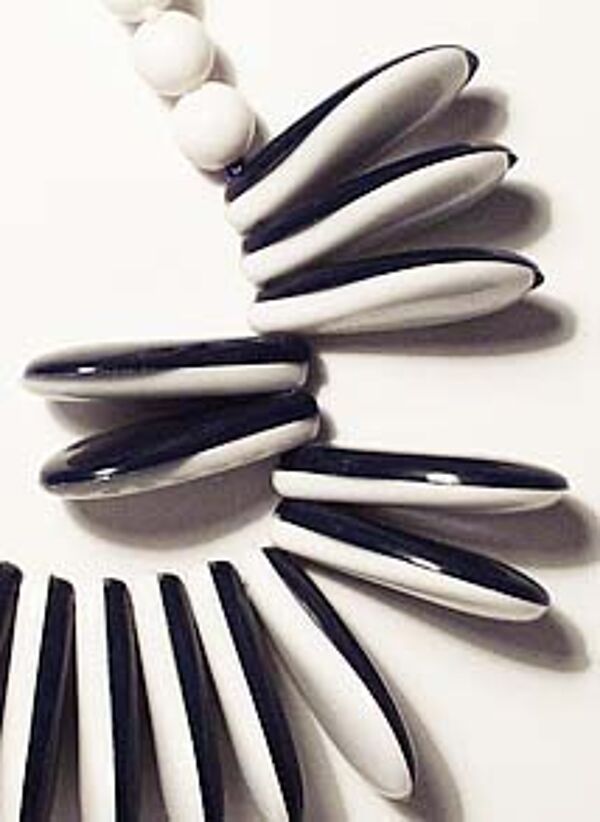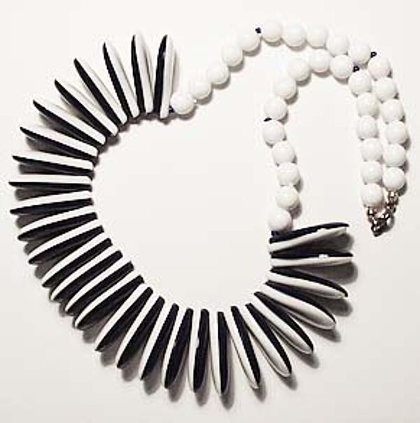 Kette, die in ihrem zentralen, mittleren Anteil aus annähernd ovalen Kunststoffscheiben mit je einer weißen und einer schwarzen Seite bzw. an den beiden Enden aus kleineren weißen Kunststoffperlen zusammengesetzt ist, Länge ca. 42 cm. Wohl Deutschland der 70er Jahre.