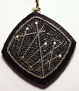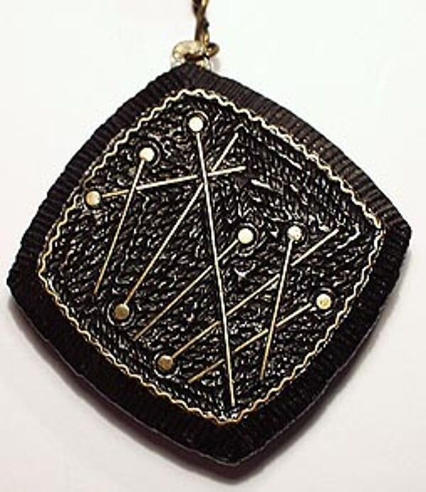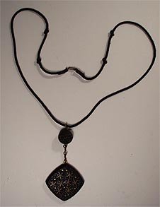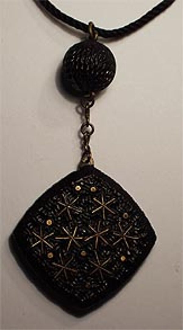 Der Anhänger aus schwarzem Kunststoff mit quadratischer Grundform und goldfarbenem, abstrakten, zeittypischen Dekor wird durch eine kleine, mit einer Kunststoffkugel verzierten Kette von der mit mehreren Knoten versehenen Kordel separiert, L.: ca. 76 cm. Wohl Deutschland der 60er / 70er Jahre.
