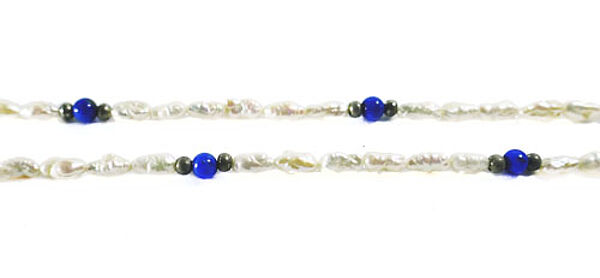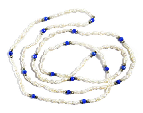 Zarte Flussperlenkette mit eingestreuten Lapislazuli- und Silberperlen. Länge ca. 90 cm, geringe Altersspuren, so sind die Silberperlen etwas angelaufen. Wohl Spanien der 1970er, 80er Jahre.