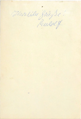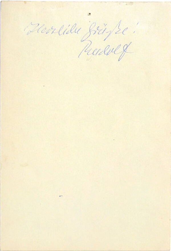 Grüntoniger Linolschnitt auf fast weißem Papier, montiert auf dünnem Karton. Rechts unterhalb der Darstellung mit Bleistift handsigniert, links bezeichnet "Handdruck", rückseitig vom Künstler beschriftet: "Herzliche Grüße! Rudolf". Bildmaße ca. ca. 19,3 x 11,7 cm, Kartonmaße ca. 21 x 14,3 cm, geringe Alters-, Griff- und Lagerspuren. Wohl 1970er Jahre.