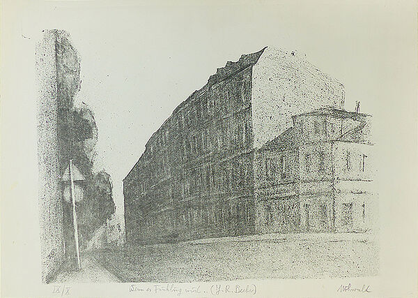 Lithografie: "Wenn es Frühling wird… (J. R. Becher)", dargestellt ist die Triftstraße in Halle